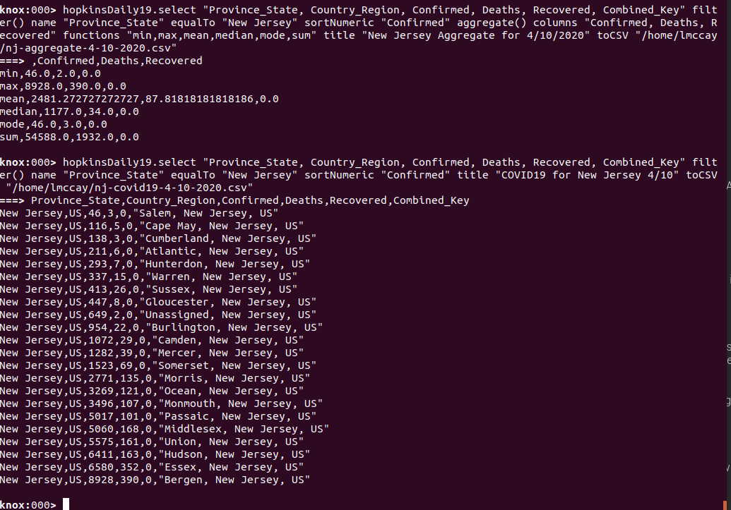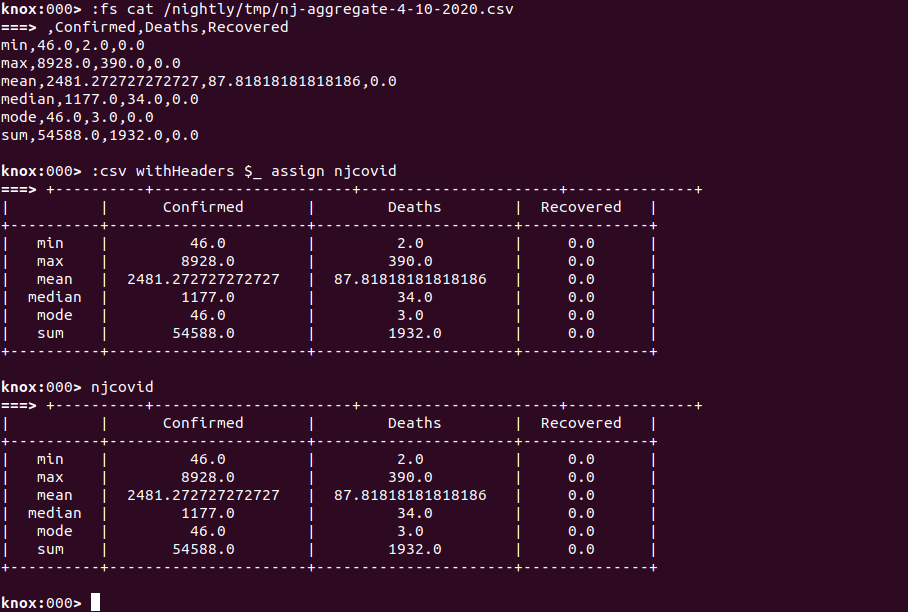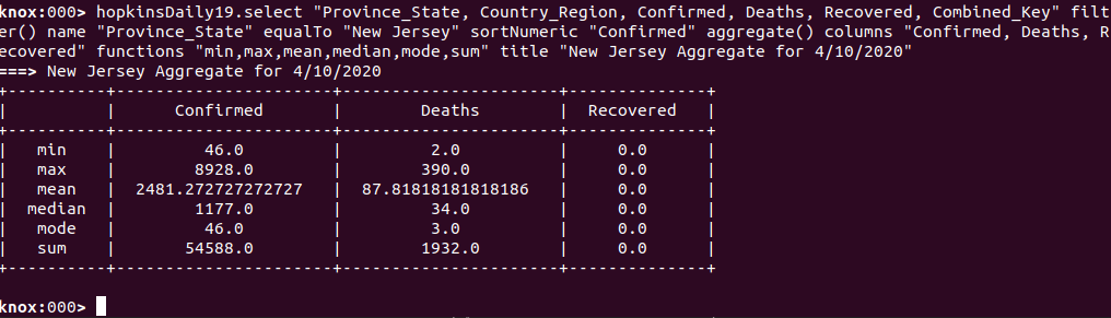 From the above operation, we can now see the COVID19 data for New Jersey counties for 4/10/2020 sorted by the number of Confirmed cases and the subset of cols of the most interest and tailored to fit our screen. From the above table, we can visually see a number of insights in terms of the most affected counties across the state of New Jersey but it may be more interesting to be able to see an aggregation of some of the calculations available for numeric columns through KnoxShellTable. Let’s take a look at an aggregate table for this dataset.