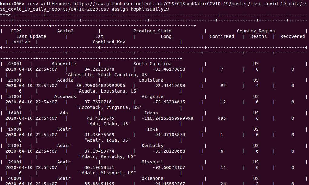 As you can see the result of creating the table from a CSV file is a rendering of the entire table and often does not fit the screen propertly. This is where the operations on the resulting table come in handy for explorer the dataset. Let’s filter the above dataset of COVID19 across the world to only a subset of columns and for only New Jersey by selecting, filtering and sorting numerically by number of Confirmed cases.