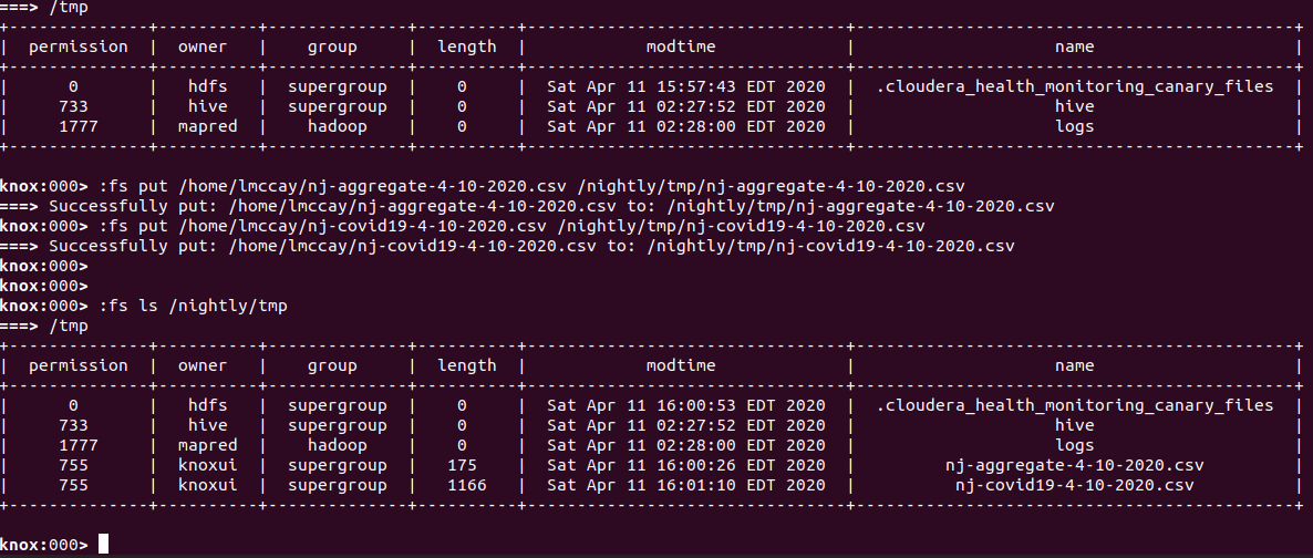Now that we have these tables persisted to local disk, we can use our KnoxShell Filesystem commands to add them to the datalake.