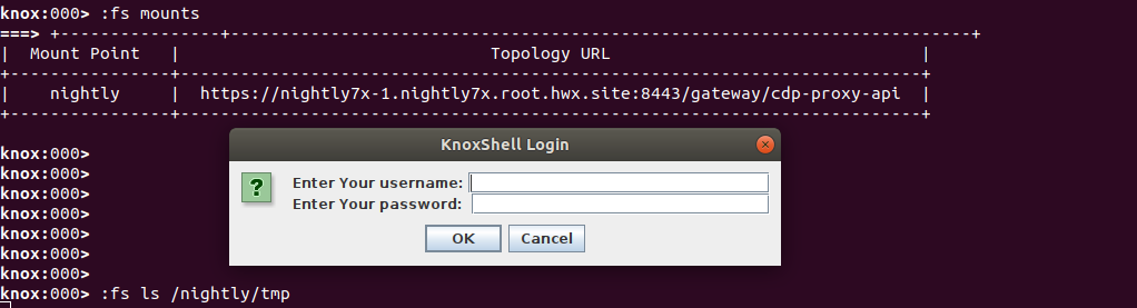 Once we have the desired mount, we may now access it by specifying the mountpoint name as the path prefix into the HDFS filesystem. Upon mounting or first access, the KnoxShell will prompt for user credentials for use as HTTP Basic credentials while accessing WebHDFS API.