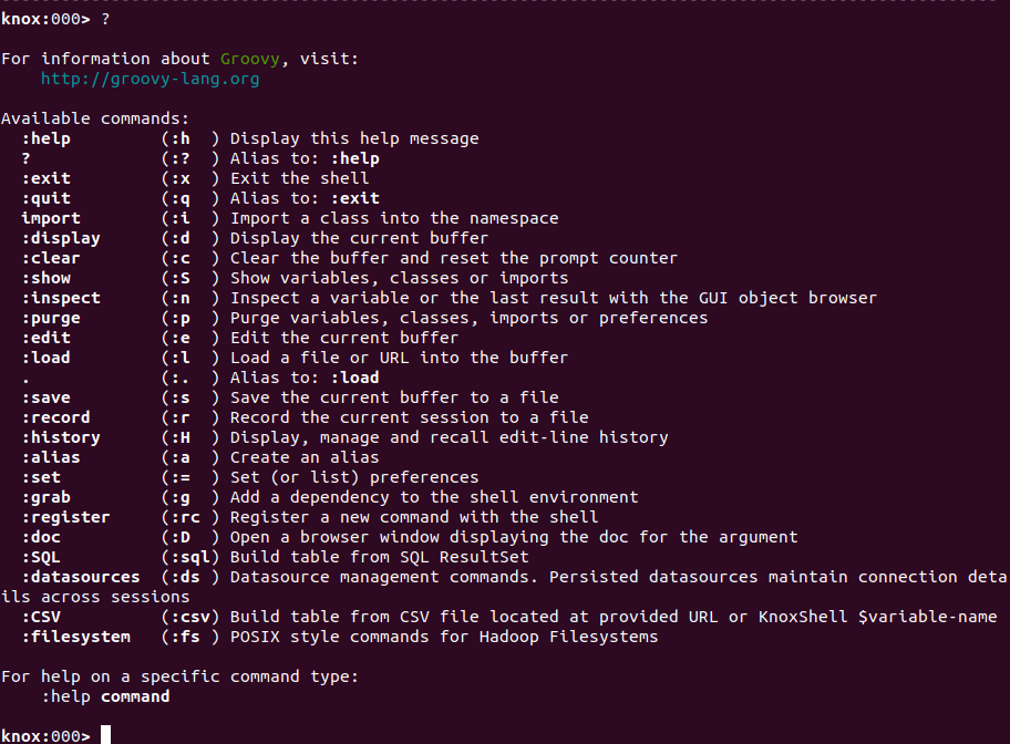 The KnoxShell environment has been extended to provide more of an interactive experience through the use of custom commands and the newly added KnoxShellTable rendering and dataset representation class. This is provided by integrating the power of groovysh extensions and the KnoxShell client classes/SDK and make for some really powerful command line capabilities that would otherwise require the user to SSH to a node within the cluster and use CLIs of different tools or components.